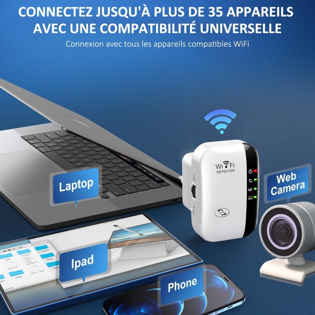 مصمم ليعمل بانسجام تام مع 100% من أجهزة المودم والراوتر الموجودة في الأسواق. كما أنه يوفر اتصالاً ثابتاً وسلساً لجميع أجهزتك: بدءاً من الهواتف الذكية (آيفون وأندرويد)، واللابتوبات، وصولاً إلى أجهزة البلايستيشن، التلفزيونات الذكية، وحتى كاميرات المراقبة وأجهزة المنزل الذكي.
